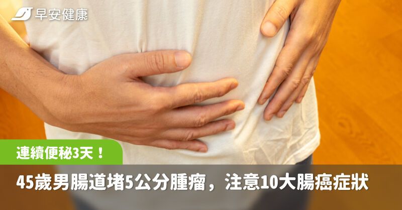 多天沒正常排便、排氣就該注意!台北一名45歲的蘇先生一向健康,也沒有家族病史,卻因連續3天無法排氣、排便,腹脹到無法進食,緊急到台北慈濟醫院就診。經電腦斷層檢查發現,他的降結腸處竟長了一顆5公分腫瘤,導致腸道完全阻塞。