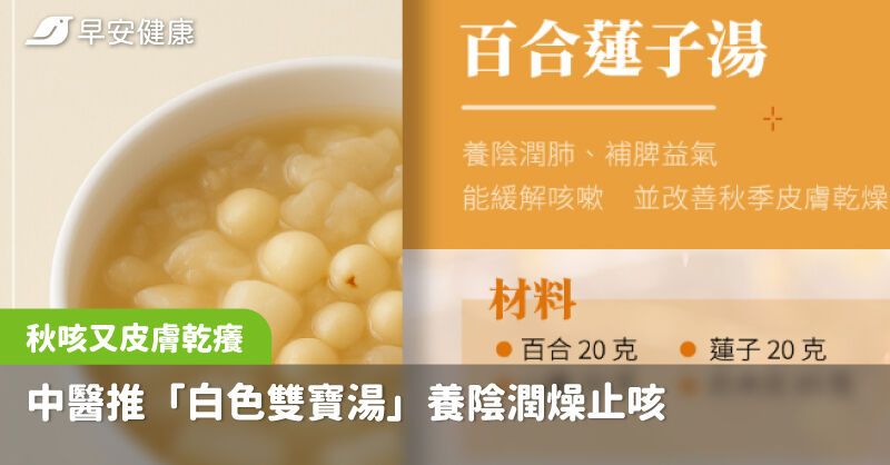 取百合 20 克、蓮子 20 克、山藥 30 克、白木耳 15 克,搭配少量冰糖,燉煮成湯。此藥膳養陰潤肺、補脾益氣,能緩解咳嗽,並改善秋季皮膚乾燥。